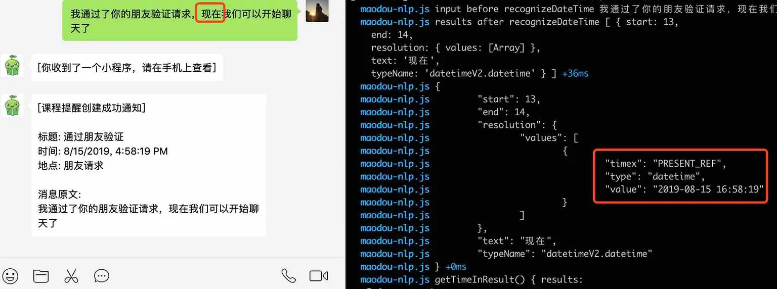 由于和客户沟通的入口,都放在微信小助手,而小助手新加好友后,微信会有自动回复:我通过了您的朋友验证请求,现在我们可以开始聊天了,其中关键词现在,会导致识别出当前时间,让小助手创建提醒,并推送给新加好友,造成不好的体验。