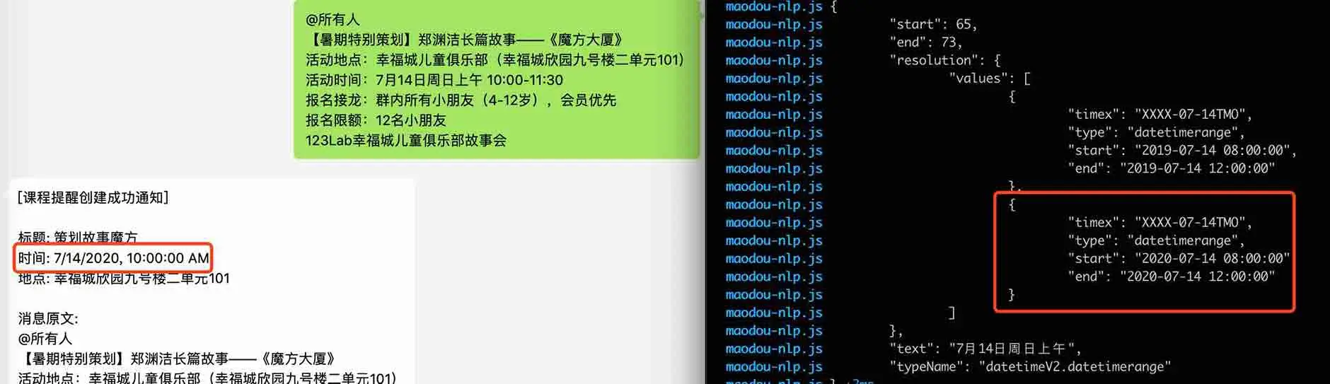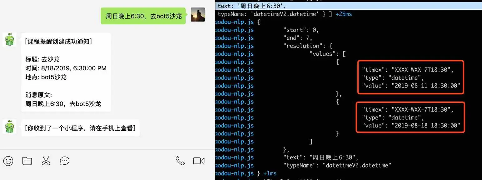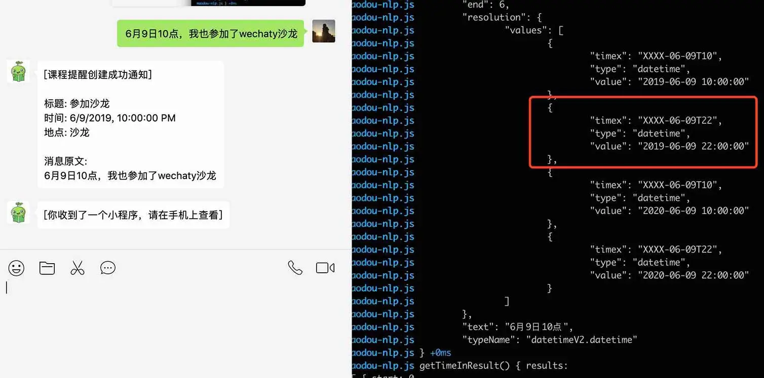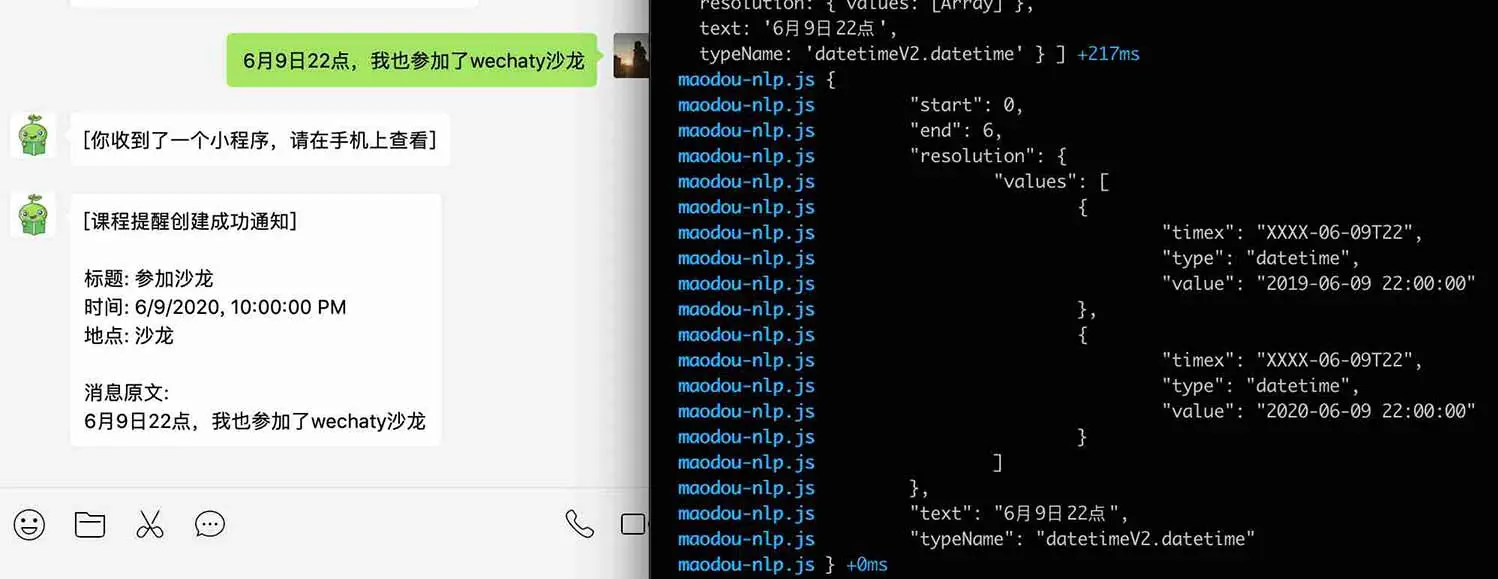 目前,wechaty发送微信小程序,毛豆小助手的时间识别,还有许多需要改进的地方。我们希望逐步的完善,找到一个最佳的体验。