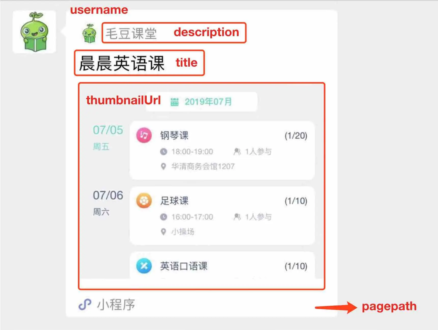 thumbnailurl是预留的,目前还不起作用,计划未来通过这个url传送一个图片,用于小程序的封面,其余各项对应关系如下图