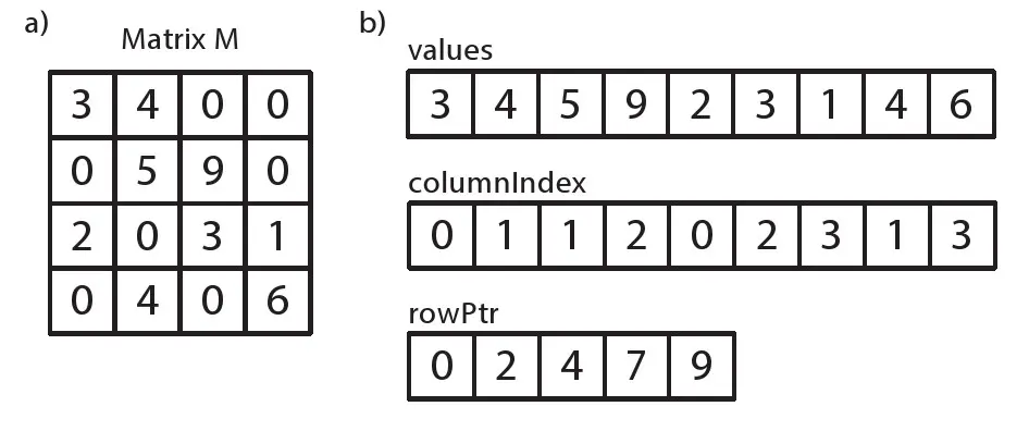 行指针(rowPtr):每行首个非零元素在values数组中的位置(最后一个值为稀疏矩阵非零元素的个数)