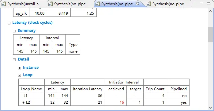 但是代码中的内层循环Vivado HLS是无法完全展开的,因为循环边界不是常量。故case3 case4 的优化达不到预想的要求。