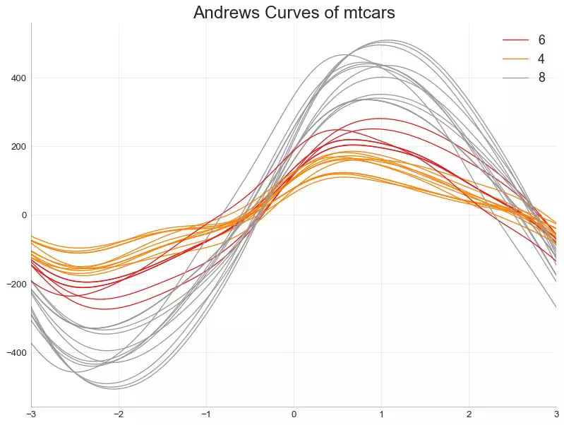 安德鲁斯曲线有助于可视化是否存在基于给定分组的数字特征的固有分组。 如果要素(数据集中的列)无法区分组(cyl),那么这些线将不会很好地隔离,如下所示。