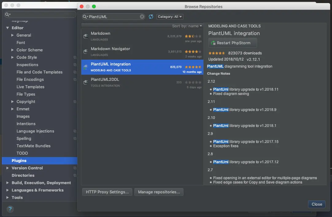 PhpStrom->Perferences->Plugins->搜索PlantUML->install(位置是在下图的Restart PhpStorm,此处我是install了之后,显示让我从启动的,哈哈哈哈哈)