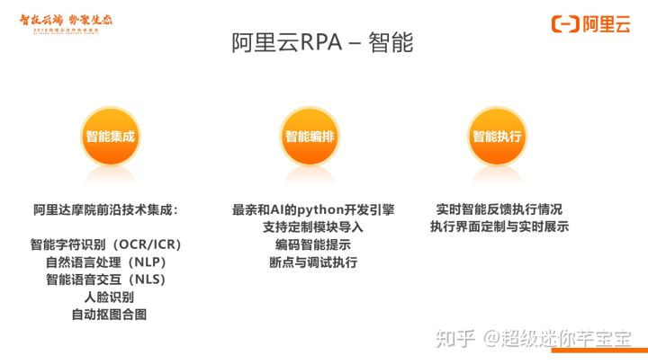 我们和阿里云、阿里达摩云的OCR去合作阿里云,阿里的OCR的能力在增值税发票上的识别率已经到99.5%以上,而且还在持续增加。阿里达摩院的自然语言处理还有语音交互、人脸识别。这是我们在智能集成领域可以做的事情。另外我们还对阿里云RPA的编排领域做了引擎。它对于AI的亲和性非常强,有一些组件可以随时调用进来。
