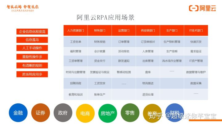 阿里云RPA在目前这个阶段,马老师经常说AI这个阶段,人类远远没有达到。现在企业普遍存在系统信息化的孤岛比较严重,人工手动操作多、重复性操作多、有清晰的规则以及跨系统应用多的问题。这里存在大量可以自动化操作的实例,可以在各个不同的点上去提升各个部门的职员的工作效率,进而提升整个系统的效率。