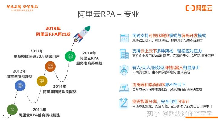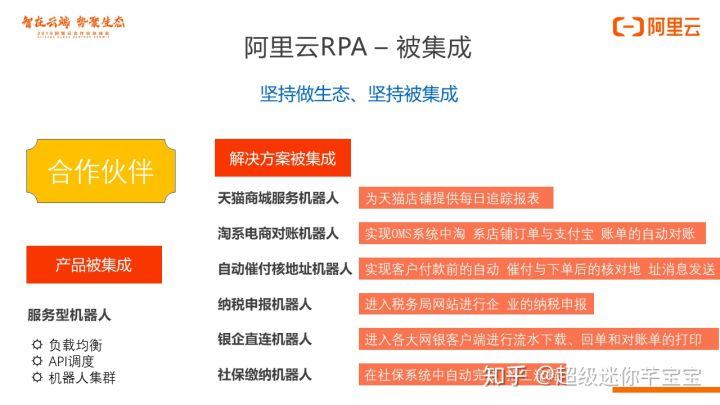 1、产品被集成,意味着我们要能够躲在后面,允许我们的合作伙伴在前台去帮助自己的产品打造它更强的核心力。为什么说ERP不能有RPA,为什么说CRM不能有RPA。所有产品都为自己的产品可以集成RPA能力,使用我们的服务型机器人。我们通过阿里非常多的服务端的能力,去做RPA调度和服务型集群。