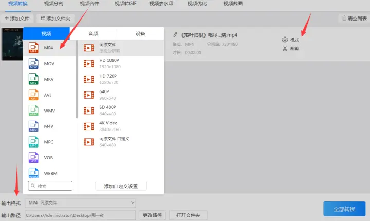 3、把输出格式设置为mp4格式后设置视频转换后的mp4文件存储到电脑的“输出路径”。设置时可以在输出路径的输入框中直接填写路径,也可以点击“更改路径”按钮选择需要输出的路径。