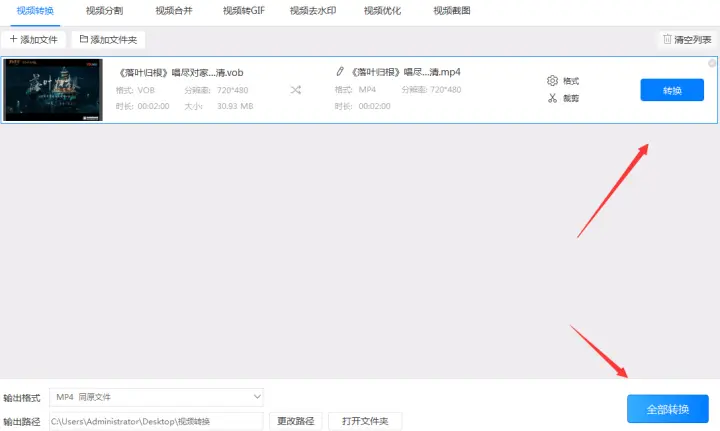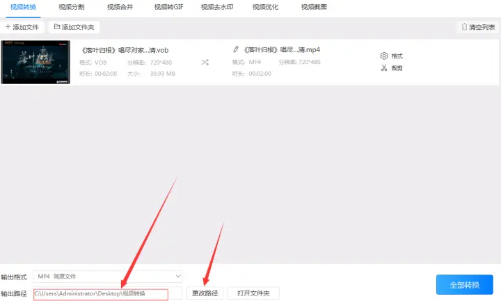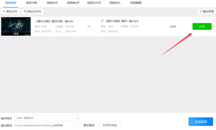 4、调整好输出路径的参数后点击“转换”按钮逐个转换视频,也可以点击软件右下角的“全部转换”按钮统一把DVD里的vob格式转换成mp4格式。
