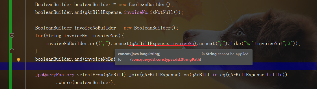 invoiceNoBuilder.or(qArBillExpense.invoiceNo.endsWith((",").concat(invoiceNo)));