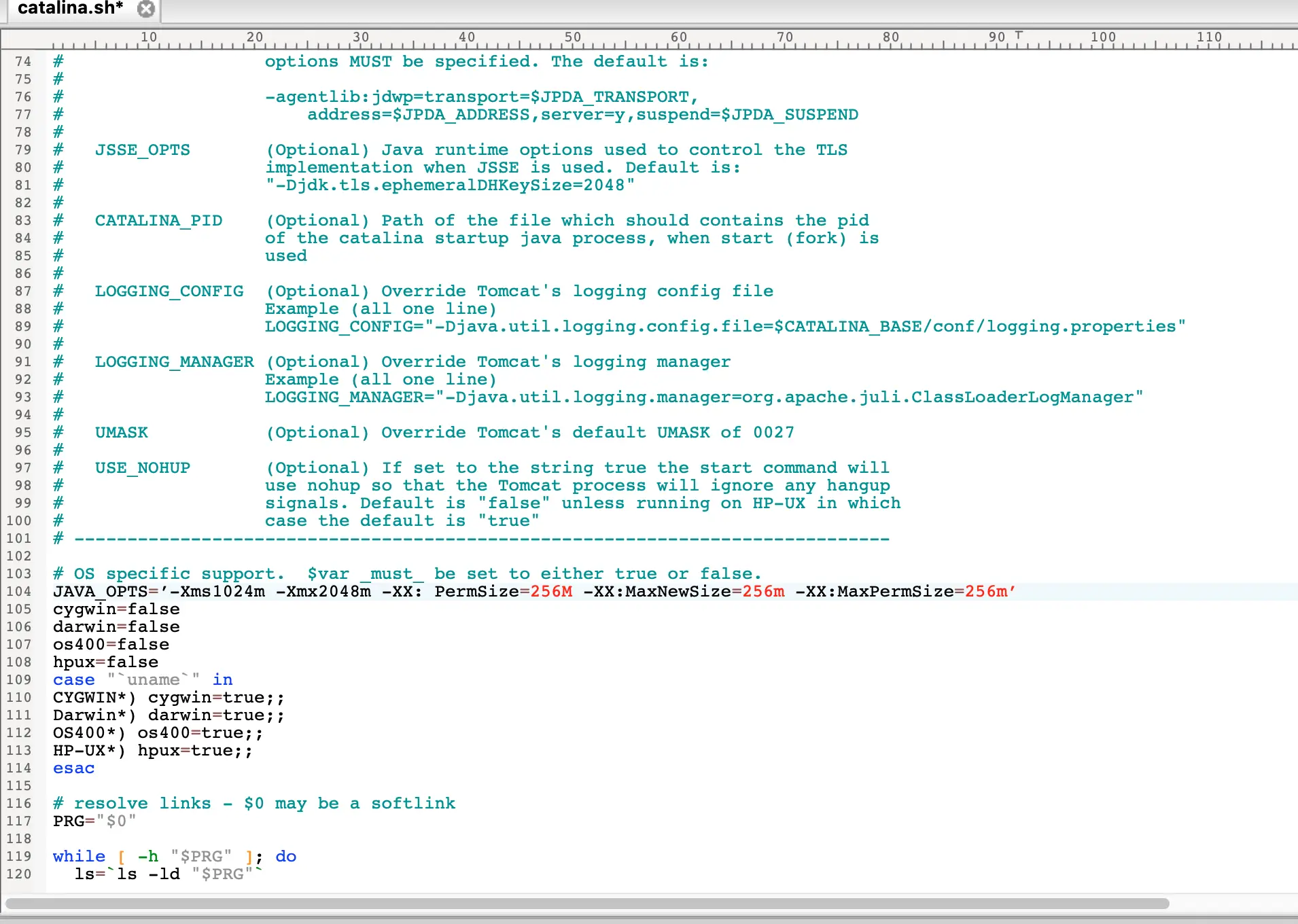 将以上配置信息在tomcat中的catalina.sh 中配置如下图所示: