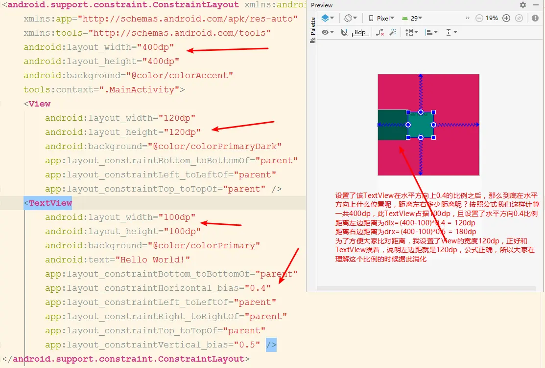 模板中声明了一个TextView,且处于屏幕中间。如何做到的呢?上面四个属性顾名思义都指定了TextView与Parent(父布局)的关系,约束布局如果不指定水平和竖直方向的百分比,默认是50%,所以会居中。如果想要指定百分比使用如下属性:(使用横向比例需要指定左右关系,使用竖直比例需要指定上下关系)