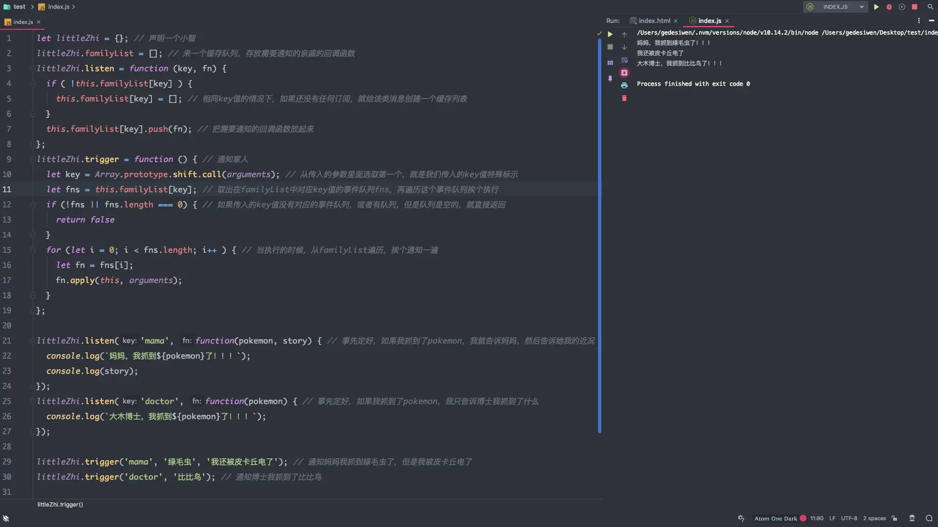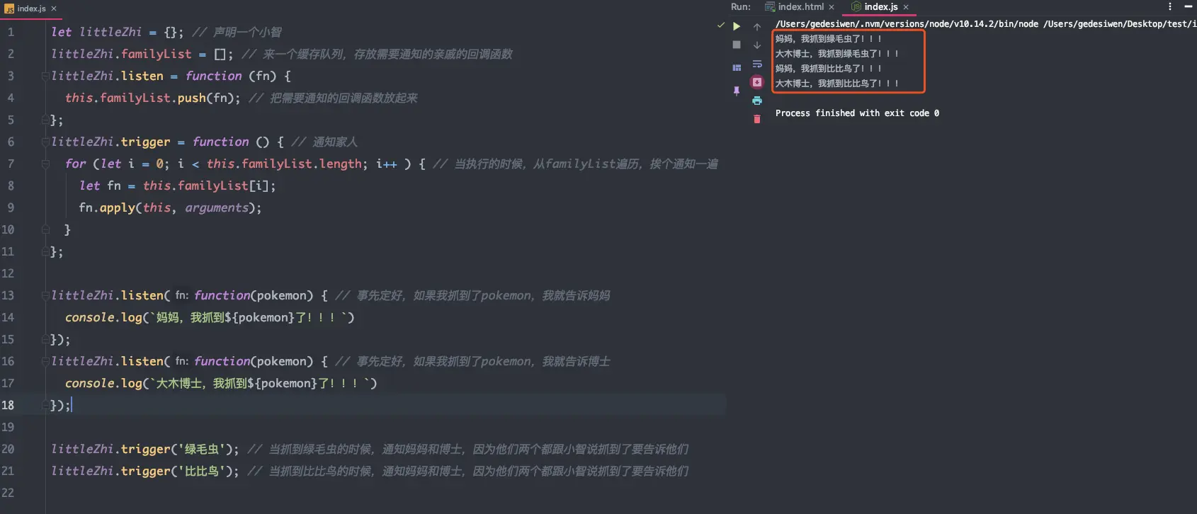 这样,我们实现了当小智捉到神奇宝贝的时候,就会通知妈妈和大木博士。之前没抓到的时候就不用通知了,不管在什么时候抓到了,只要执行littleZhi.trigger()这个方法,妈妈和大木博士就可以收到通知了