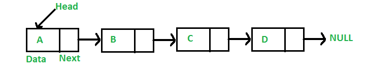 链表的每一个节点通过“指针”链接起来,每一个节点有2部分组成,一部分是数据(上图中的Data),另一部分是后继指针(用来存储后一个节点的地址),在这条链中,最开始的节点称为Head,最末尾节点的指针指向NULL。