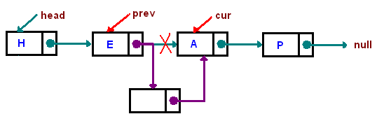 其实就算是已经定位到了某个要删除的节点了,删除逻辑也不简单。以“删除上图的E节点”为例,假如当前链表指针已经定位到了E节点,删除的时候,需要将这个E节点的前面一个节点H的后继指针改为指向A节点,那么E节点就会自动脱落了,但是当前链表指针是定位在E节点上,如何去改变H节点的后续指针呢,对于“单向链表”而言,这个时候需要从头遍历一遍整个链表,找到H节点去修改其后继指针的内容,所以时间复杂度是O(n),但如果当前是“双向链表”,则不需要遍历,直接通过前继指针即可找到H节点,时间复杂度是O(1),这里就是“双向链表”相当于“单向链表”的优势所在。