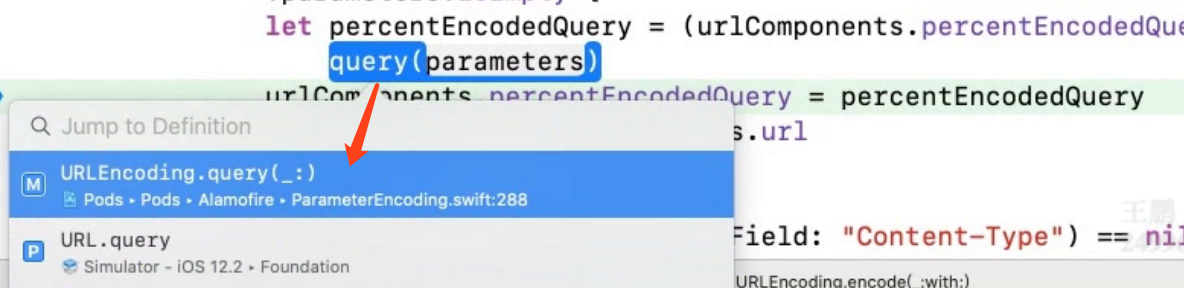queryComponents函数进行递归并进行百分号编码,然后返回一个元祖,再把元祖添加到了数组 components 中:components += queryComponents(fromKey: key, value: value)3、把元祖中的第一个元素和第二个元素用 = 连接,然后再用 & 符号进行了分割: