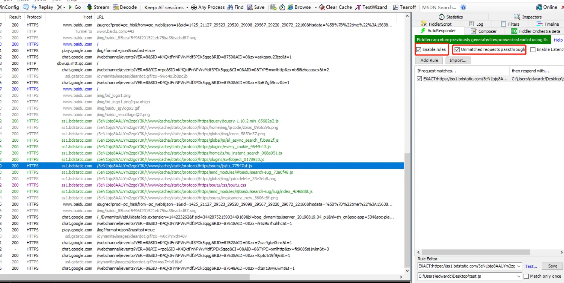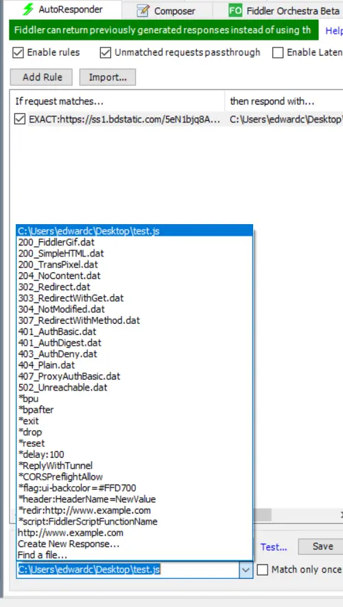 - 然后点击Add rule, 在下面找到我们刚存到本地的test.js 在里面加一句console.log('I m fiddler),点击save