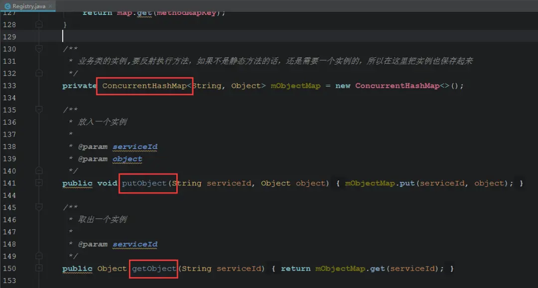 Map集合,专门用来保存每一个ServiceId对应的Object,并提供getObject和putObject方法,以便反射执行Method时所需。OK,一切准备万全。业务类的每个部分基本上都保存到了服务端进程的内存中,反射执行