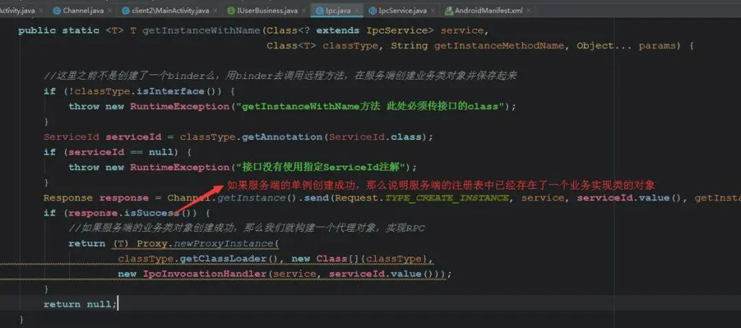上面的 getInstanceWithName,会返回一个动态代理的 业务类对象(处在客户端进程), 它的行为 和 真正的业务类(服务端进程)一模一样。这个方法有 4个参数 @paramservice 要访问哪一个远程service,因为不同的service会返回不同的Binder @paramclassType 要访问哪一个业务类,注意,这里的业务类完全是客户端自己定义的,包名不必和服务端一样,但是一定要有一个和服务端对应类一样的注解。注解相同,框架就会认为你在访问相同的业务。@paramgetInstanceMethodName 我们的业务类都是设计成单例的,但是并不是所有获取单例对象的方法都叫做getInstance,我们框架要允许其他的方法名 @paramparams 参数列表,类型为 Object[]。