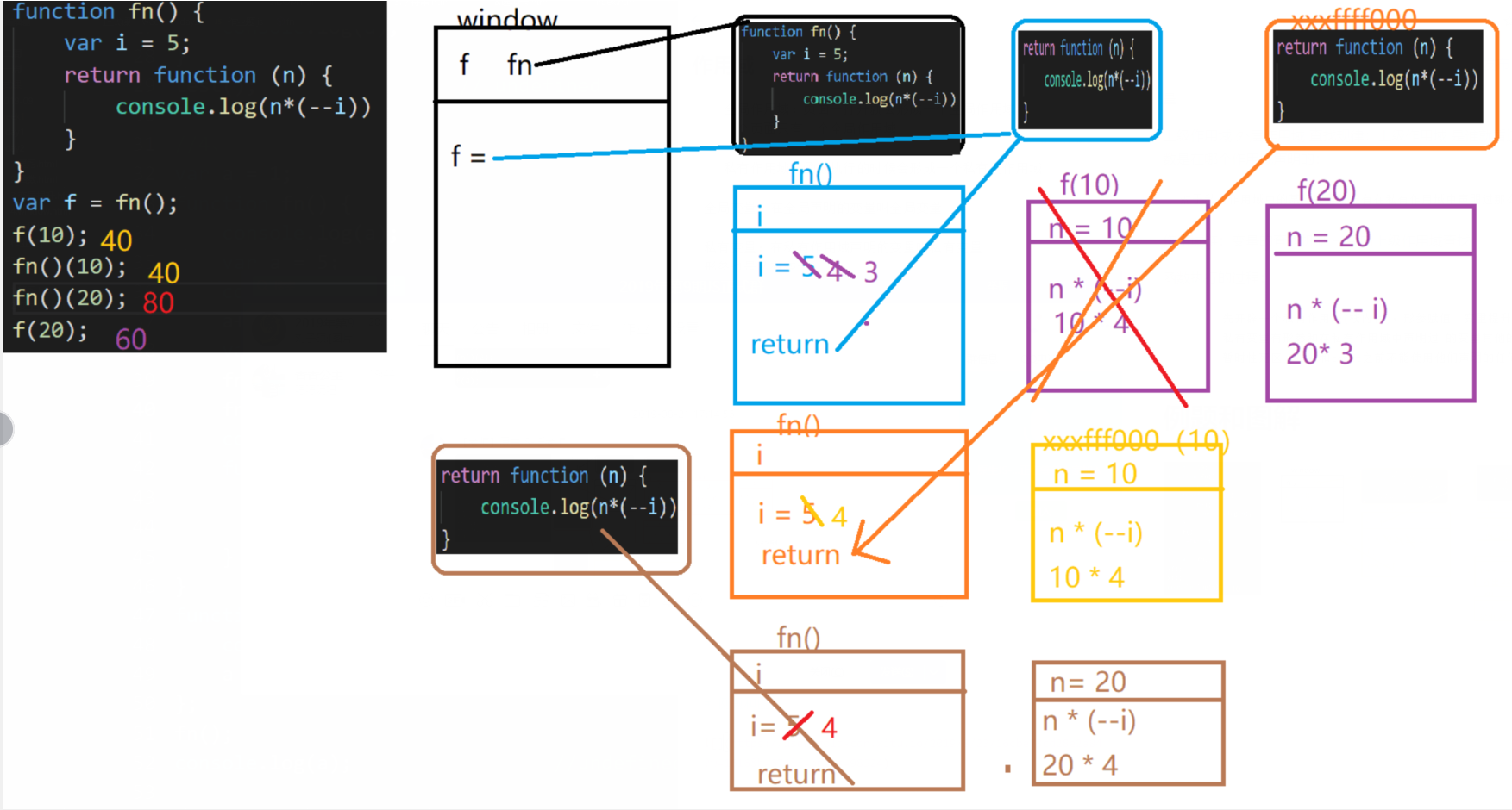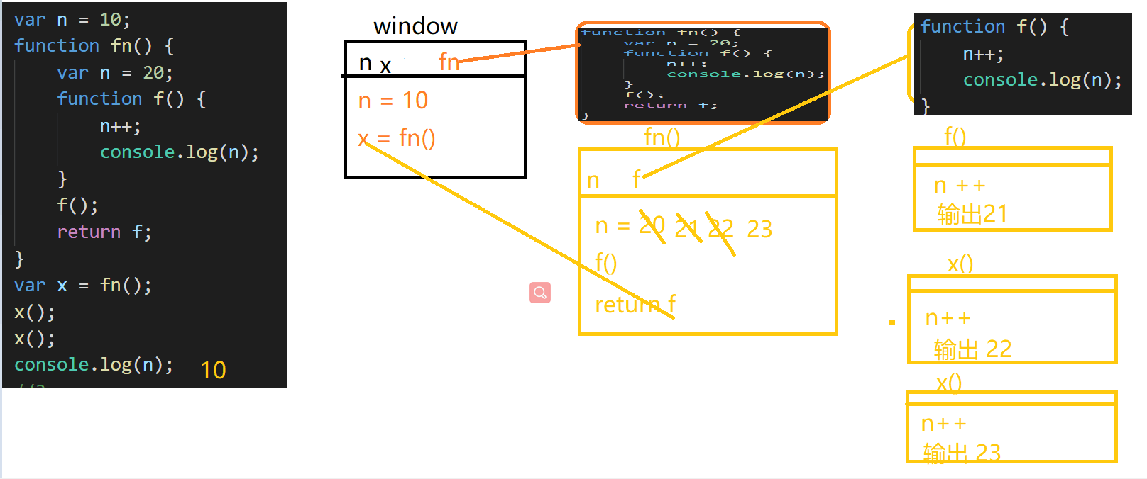 对于私有作用域中的某些变量若没有在私有作用域中声明过那么函数声明时就会去上级作用域查找该变量,上级作用域若没有该变量则接着向上级查找知道查找到全局作用域,若仍没有,则报错;