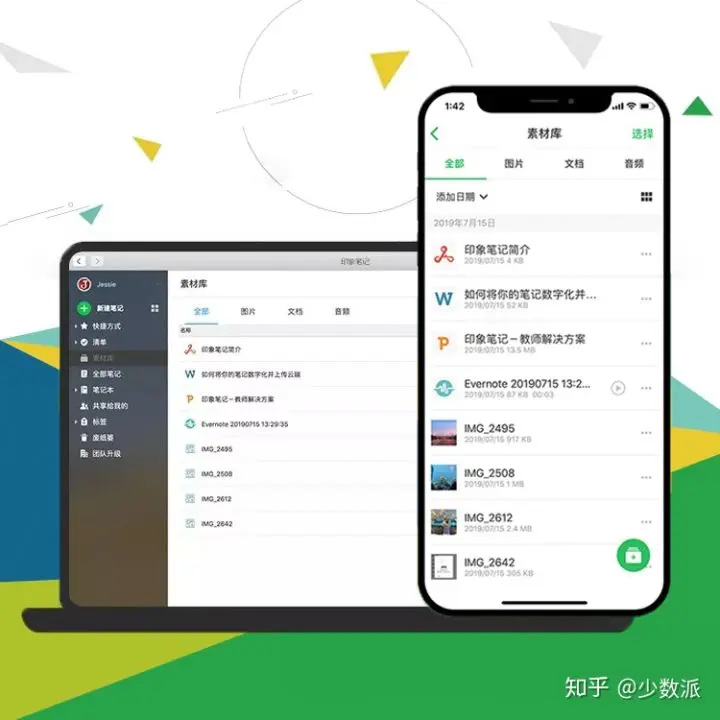 印象笔记的素材库是一个内嵌在印象笔记之中相对独立的功能模块,用来收纳文档、图片、音频类素材。目前该功能仅上线了 iOS 与 macOS,从主界面上来讲二者的差别并不是太大。