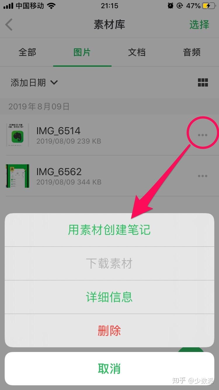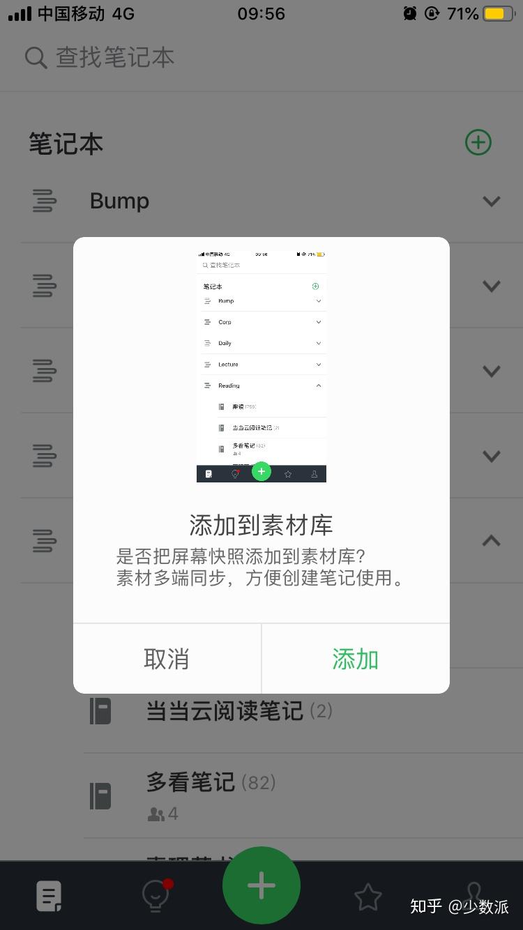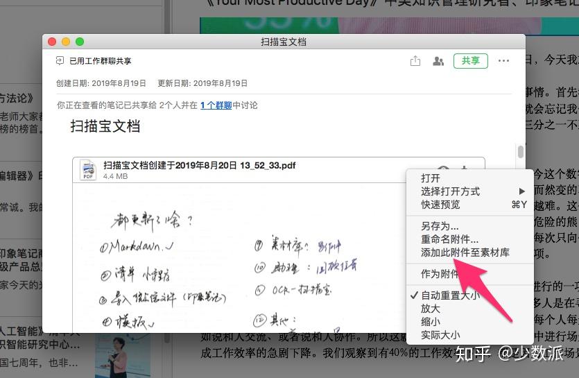 此外,在收集素材的时候,可以通过将笔记中的附件「添加到素材库中」的方式来充分利用已有的素材,最大效用的利用笔记。二次修改的时候可以充分利用这些素材。
