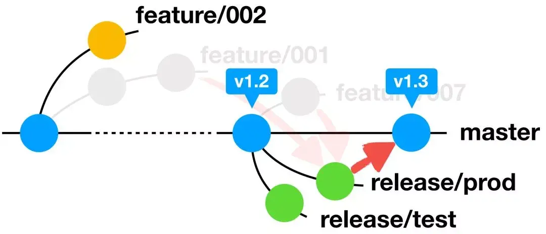 AoneFlow 的发布分支设计十分巧妙,可谓整个体系的精髓。GitFlow 先将已经完成的特性分支合并回公共主线(即开发分支),然后从公共主线拉出发布分支。TrunkBased 同样是等所有需要的特性都在主干分支上开发完成,然后从主干分支的特定位置拉出发布分支。而 AoneFlow 的思路是,从主干上拉出一条新分支,将所有本次要集成或发布的特性分支依次合并过去,从而得到发布分支。发布分支通常以<span>release/</span>前缀命名。