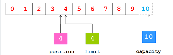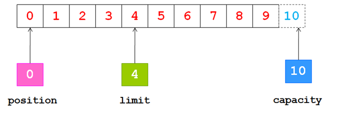 现在我们可以从通道中读取一些数据到缓冲区中,注意从通道读取数据,相当于往缓冲区中写入数据。如果读取4个自己的数据,则此时position的值为4,即下一个将要被写入的字节索引为4,而limit仍然是10,如下图所示: