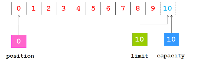由于position被设置为0,所以可以保证在下一步输出时读取到的是缓冲区中的第一个字节,而limit被设置为当前的position,可以保证读取的数据正好是之前写入到缓冲区中的数据,如下图所示: