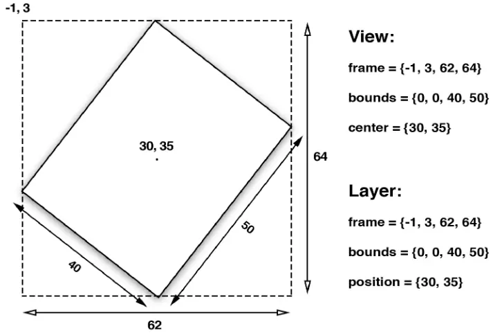 记住当对图层做变换的时候,比如旋转或者缩放,frame实际上代表了覆盖在图层旋转之后的整个轴对齐的矩形区域,也就是说frame的宽高可能和bounds的宽高不再一致了