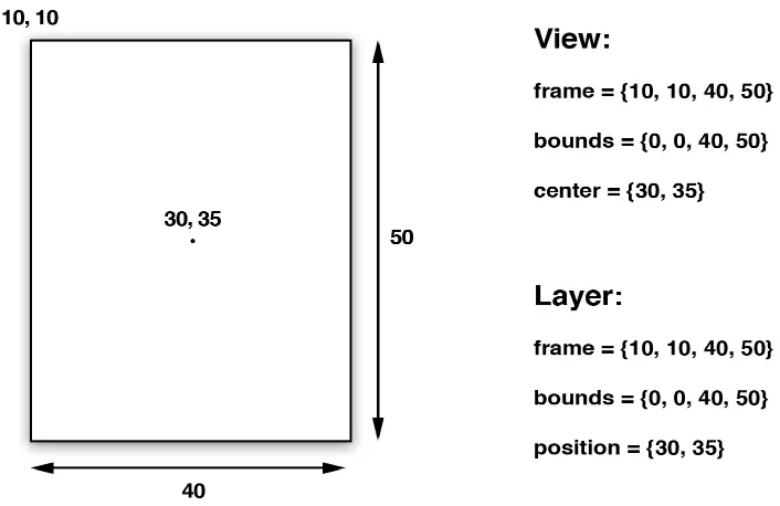 UIView有三个比较重要的布局属性:frame,bounds和center,CALayer对应地叫做frame,bounds和position。为了能清楚区分,图层用了position,视图用了center,但是他们都代表同样的值。