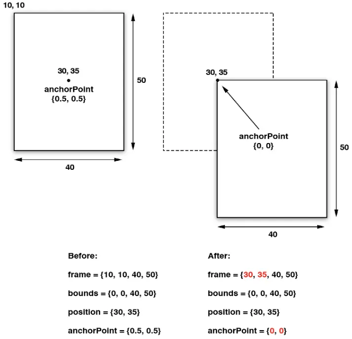 视图的center属性和图层的position属性都指定了anchorPoint相对于父图层的位置。图层的anchorPoint通过position来控制它的frame的位置,你可以认为anchorPoint是用来移动图层的把柄。