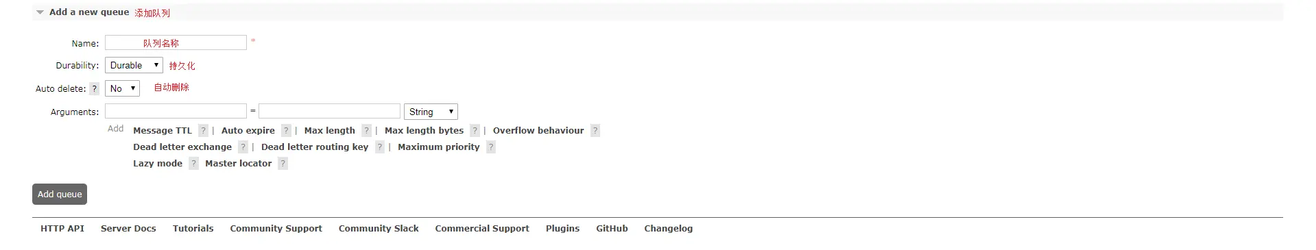 - Queues:看名字就知道意思了、比如Message TTL(消息TTL),Auto expire(自来处理动失效)等等。就不讲了