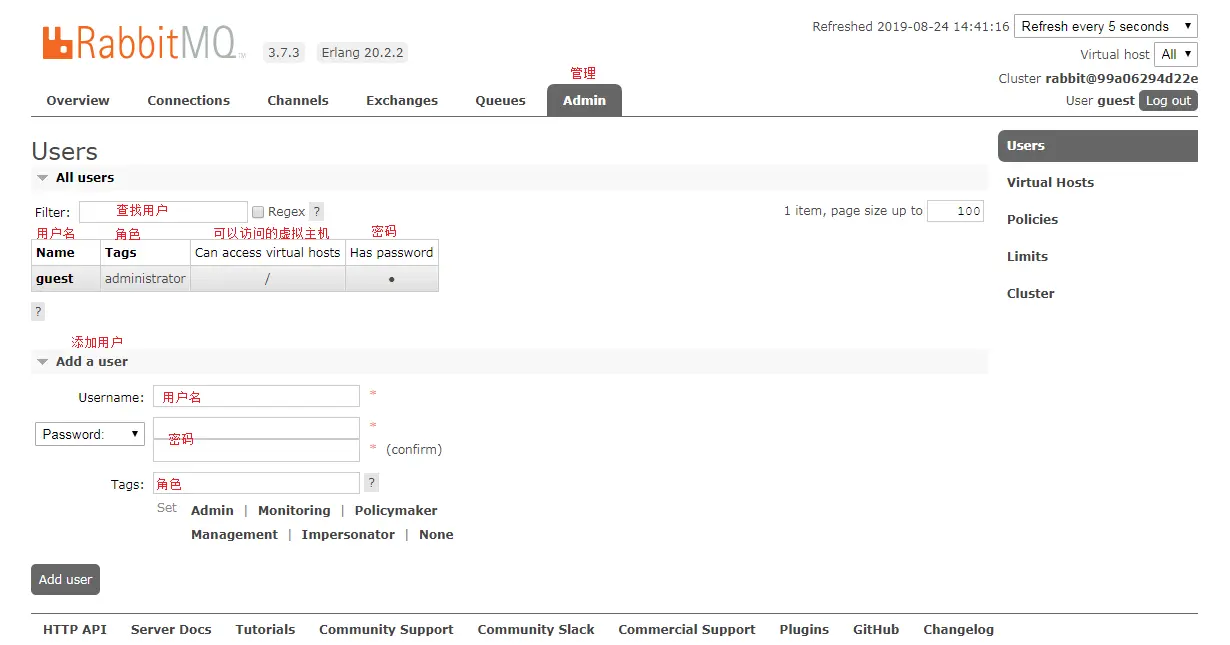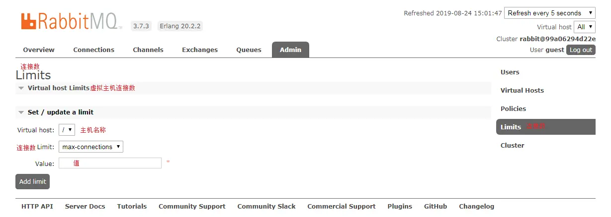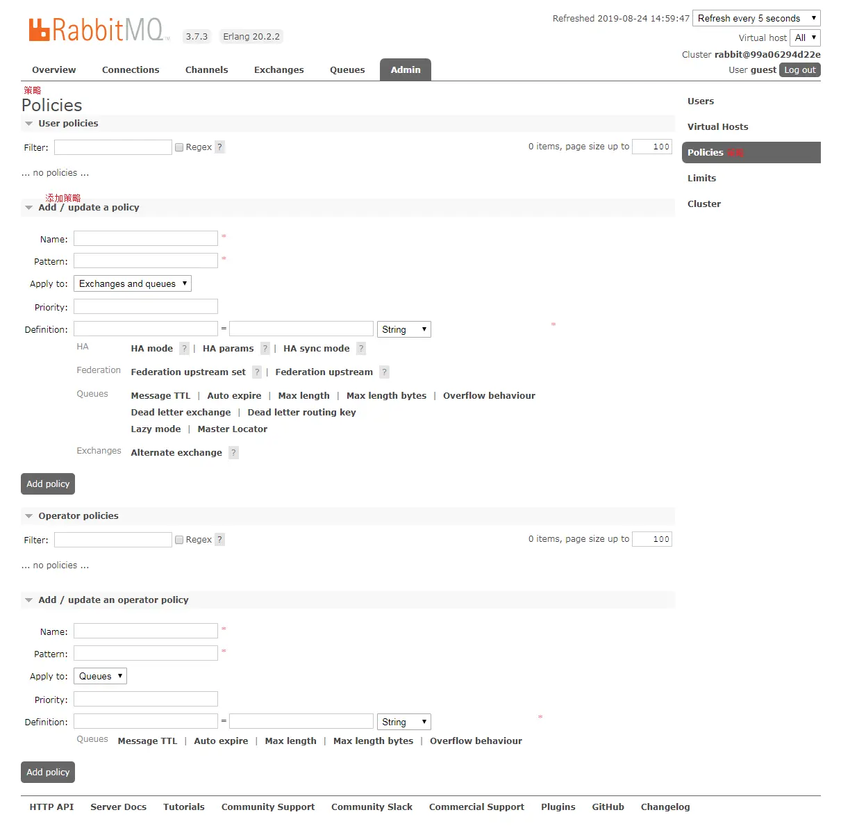 - Definition:才是真正的规则。有四大类,分别是HA(高可用性)、federation(联合)、Queues(队列)、Exchanges(备用分发器)