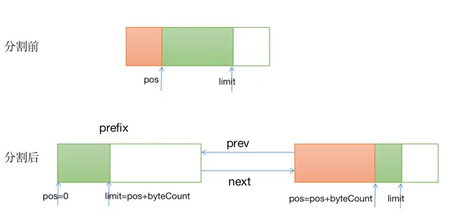 split:此方法主要是将头结点segment分裂为两个segment,第一个segment的数据为原节点数据[pos--pos+byteCount]范围内的数据,第二个节点为原节点数据[pos+byteCount--limit]范围内的数据。