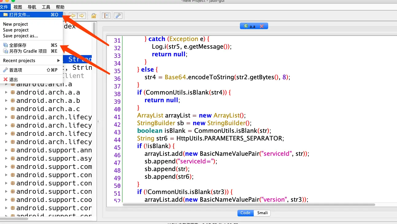 这里推荐的工具有gda(中国人自己写的)、jeb(功能强大,需要付费)、jadx(逆向出更利于阅读的代码),如果涉及到ndk,我们还需要ida,工具的具体用法这里就不详细说了。本次使用jadx进行逆向dex文件,然后保存成Java源代码进行分析,Java源码代码分析,这里使用idea(Java开发工具)。