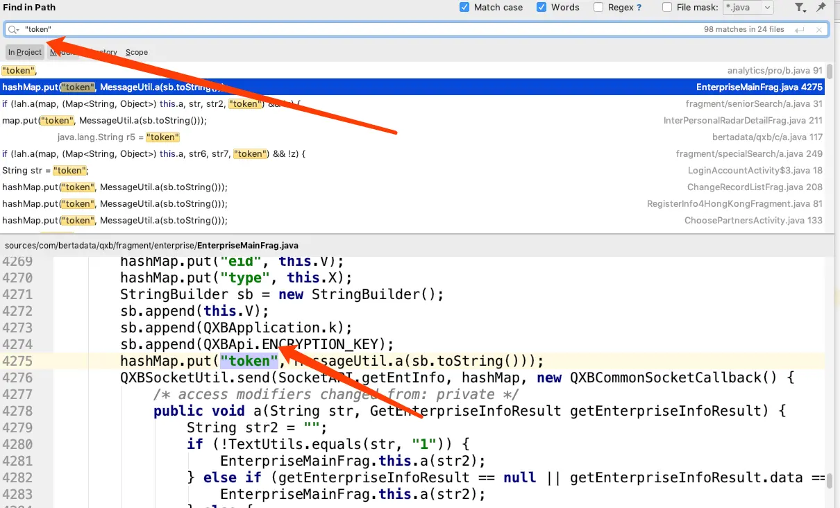 本篇就将对token静态分析,其实很简单就可以搞定那种。通过idea的全局搜索,直接搜索"token"直接找到token在哪里,上图。