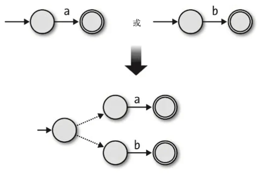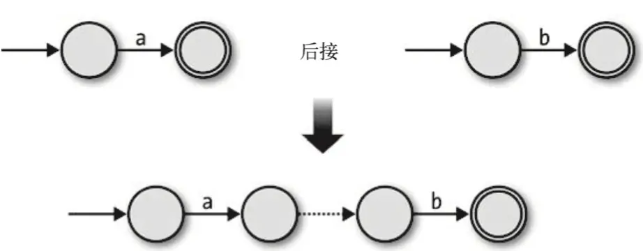 对于‘ab’字符串,我们可以把两个NFA按顺序连接到一起,用自由移动把它们连结在一起,并且保留第二个NFA的接受状态