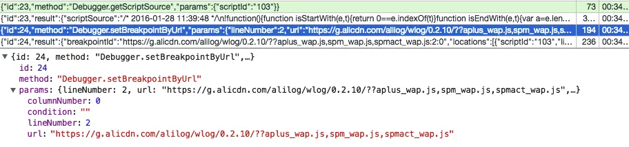 所有准备工作都做好了,现在就可以开始设置断点了。从上面的几个图中,已经可以很清楚的看到,Debugger.setBreakpointByUrl 给目标 Chrome 传递了一个 JavaScript 的 url 和断点的行号。