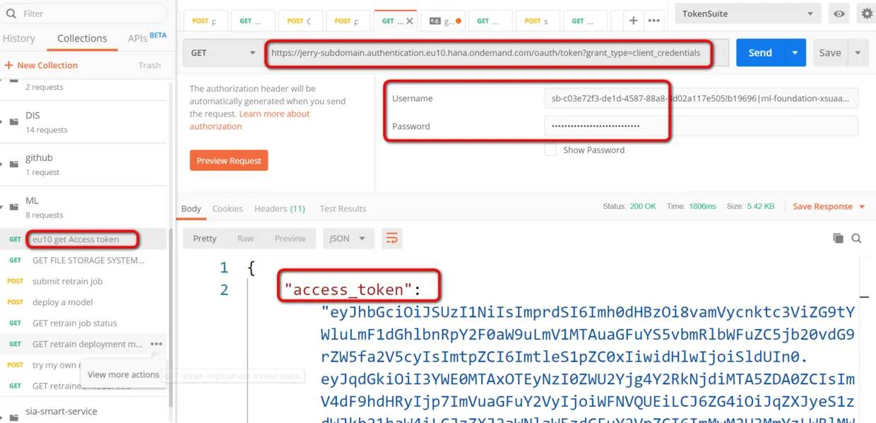 在SAP Cloud Platform cockpit里创建了service key后,会得到这个client id和secret。 要消费机器学习api,先要获得Access Token:
