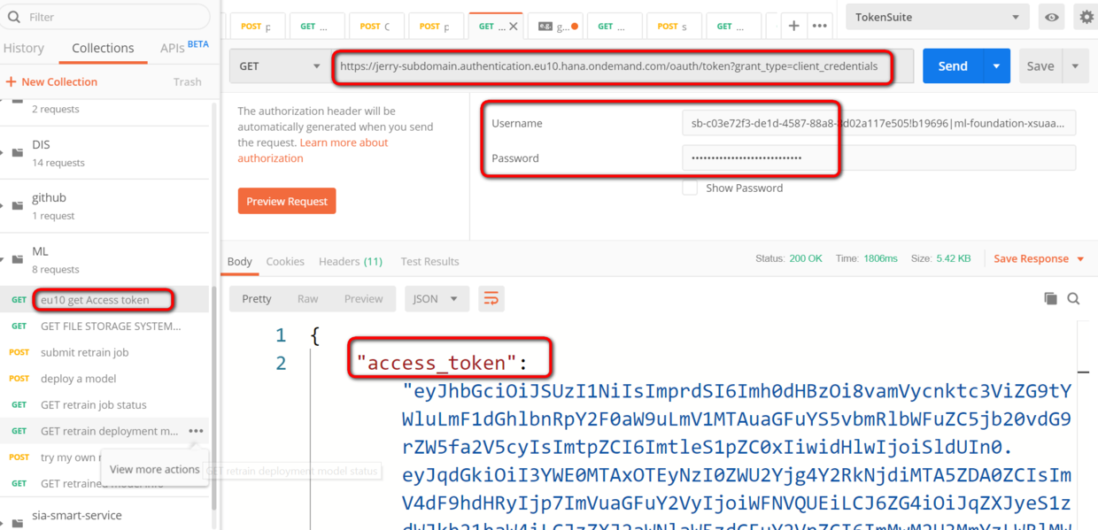 在SAP Cloud Platform cockpit里创建了service key后,会得到这个client id和secret。 要消费机器学习api,先要获得Access Token: