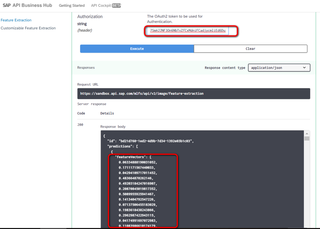 把postman里得到的Access Token填到API测试控制台的Authorization字段里,执行,就能提取到图片的feature了。
