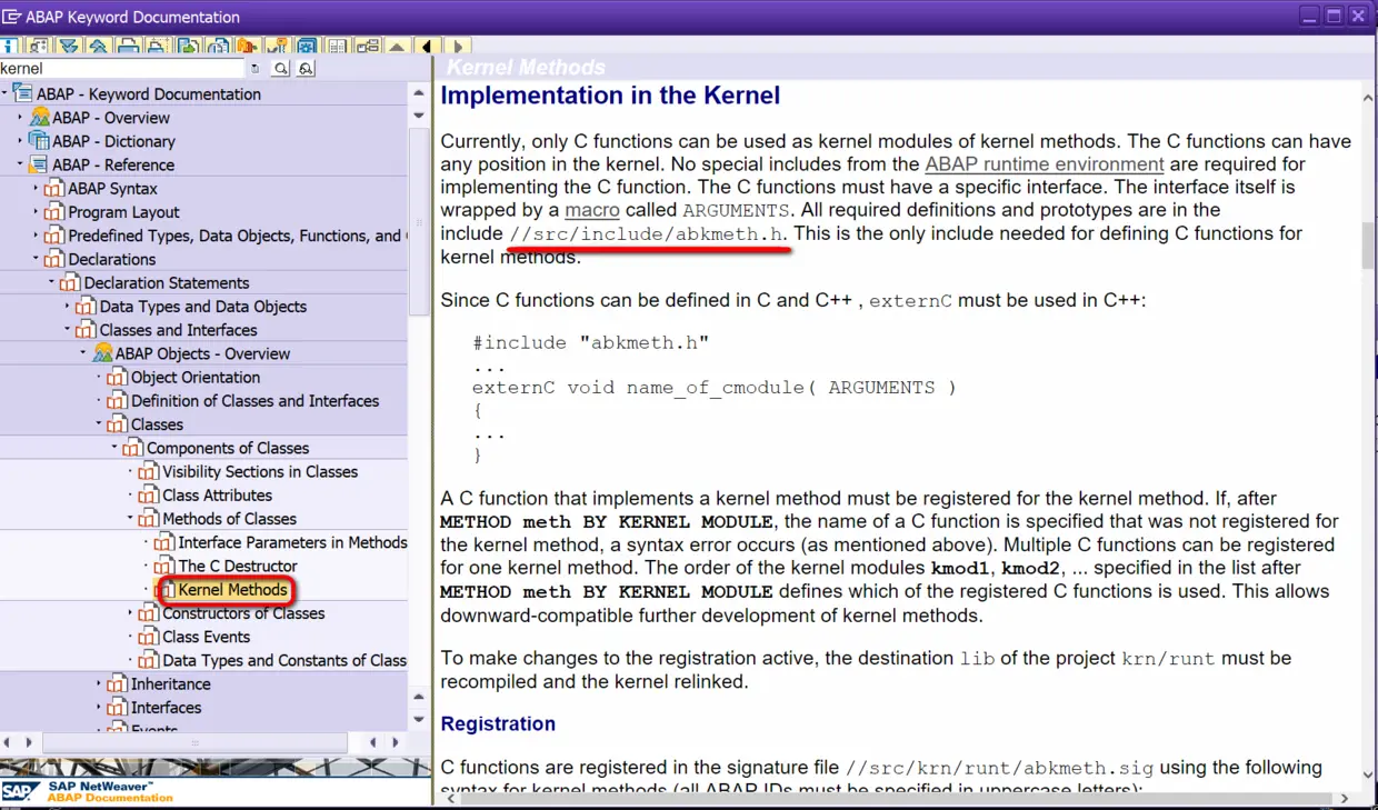 我们可以在F1唤出的ABAP帮助文档里根据关键字“Kernel"查找出ABAP kernel的相关信息: