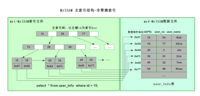 MyISAM的索引方式也叫做“非聚集”的,之所以这么称呼是为了与InnoDB的聚集索引区分。