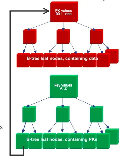 图1展示了一种可能的索引方式。左边是数据表,一共有两列七条记录,最左边的是数据记录的物理地址(注意逻辑上相邻的记录在磁盘上也并不是一定物理相邻的)。为了加快Col2的查找,可以维护一个右边所示的二叉查找树,每个节点分别包含索引键值和一个指向对应数据记录物理地址的指针,这样就可以运用二叉查找在O(log2n)O(log2n)的复杂度内获取到相应数据。