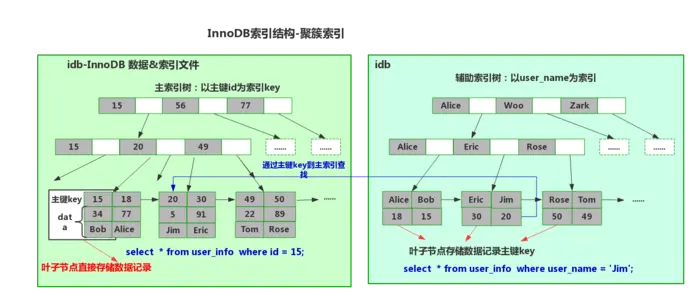 采用聚簇索引- InnoDB数据&索引文件为一个idb文件,表数据文件本身就是主索引,相邻的索引临近存储。 叶节点data域保存了完整的数据记录(数据[除主键id外其他列data]+主索引[索引key:表主键id])。 叶子节点直接存储数据记录,以主键id为key,叶子节点中直接存储数据记录。(底层存储结构: frm -表定义、 ibd: innoDB数据&索引文件)