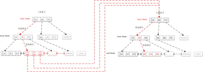 聚簇索引这种实现方式使得按主键的搜索十分高效,但是辅助索引搜索需要检索两遍索引:首先检索辅助索引获得数据记录主键,然后用主键到主索引中检索获得数据记录。InnoDB聚簇索引结构:
