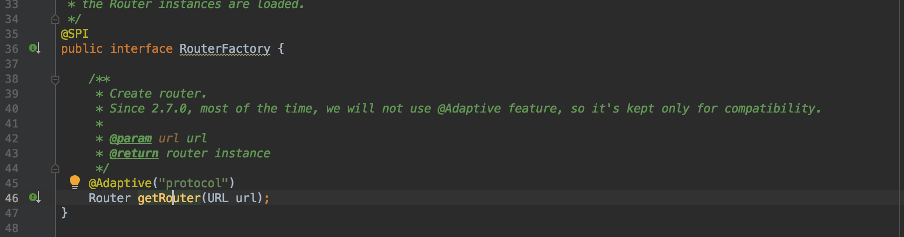 Dubbo版本2.7.3.Release. 上一篇中分了Directory中经过RouteChain转化成Invoker,本篇文章介绍调用的第二步,Router 的实现。首先看下RouteFactory的扩展点,默认是没有,通过URL中protoco中的值选择使用对应的扩展点, Router 负责从多个 Invoker 中按路由规则选出子集,比如灰度、路由等 也就是说,第一步通过 Directory 选出当前可用的服务提供者,然后再通过 Router 按规则过滤出服务提供者的子集。