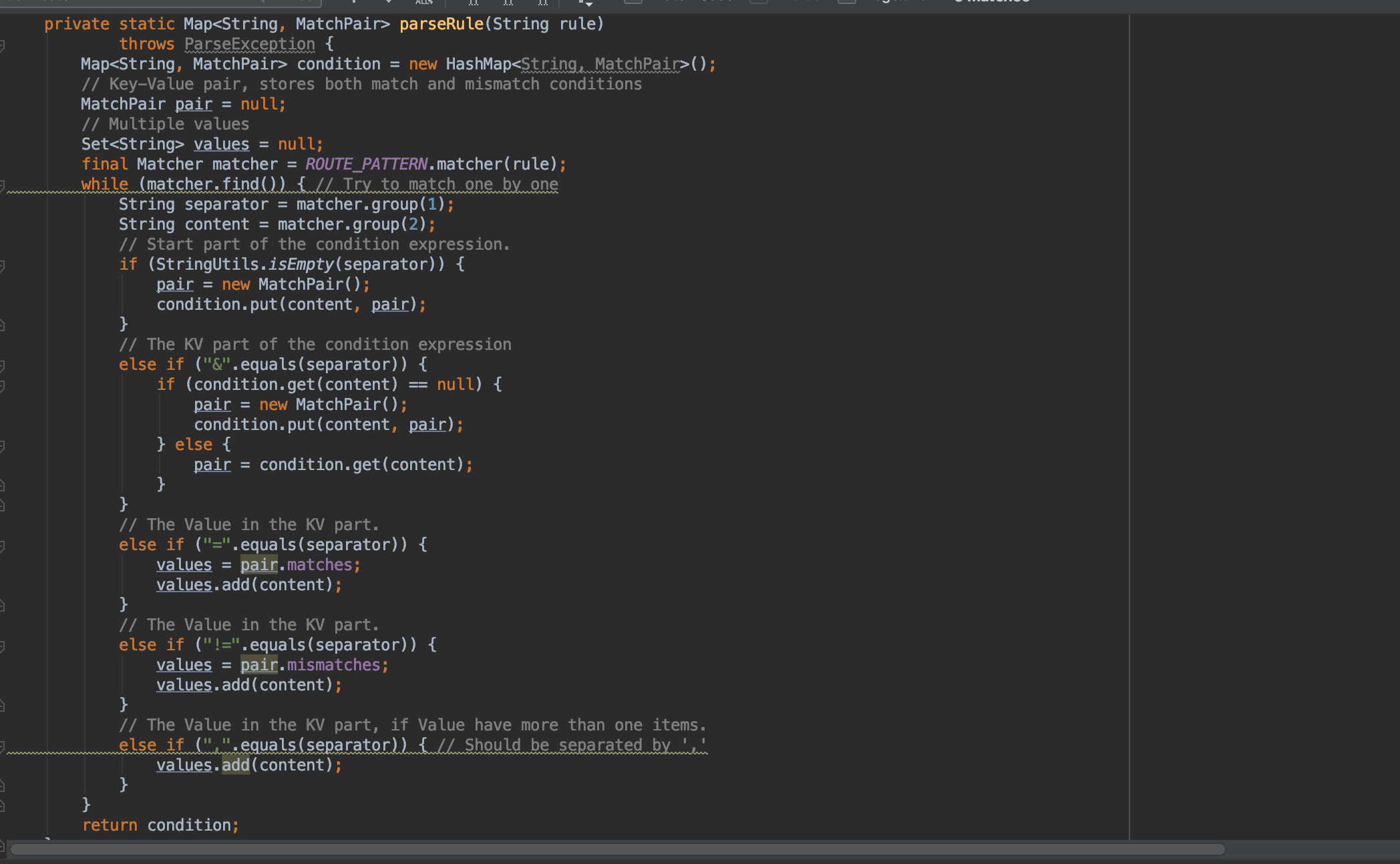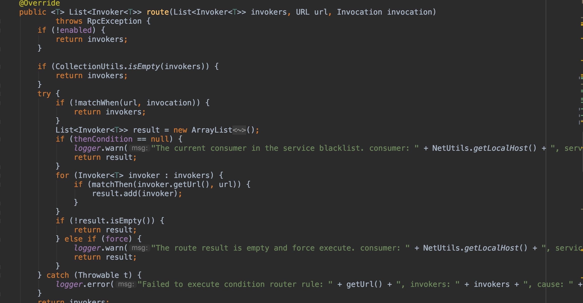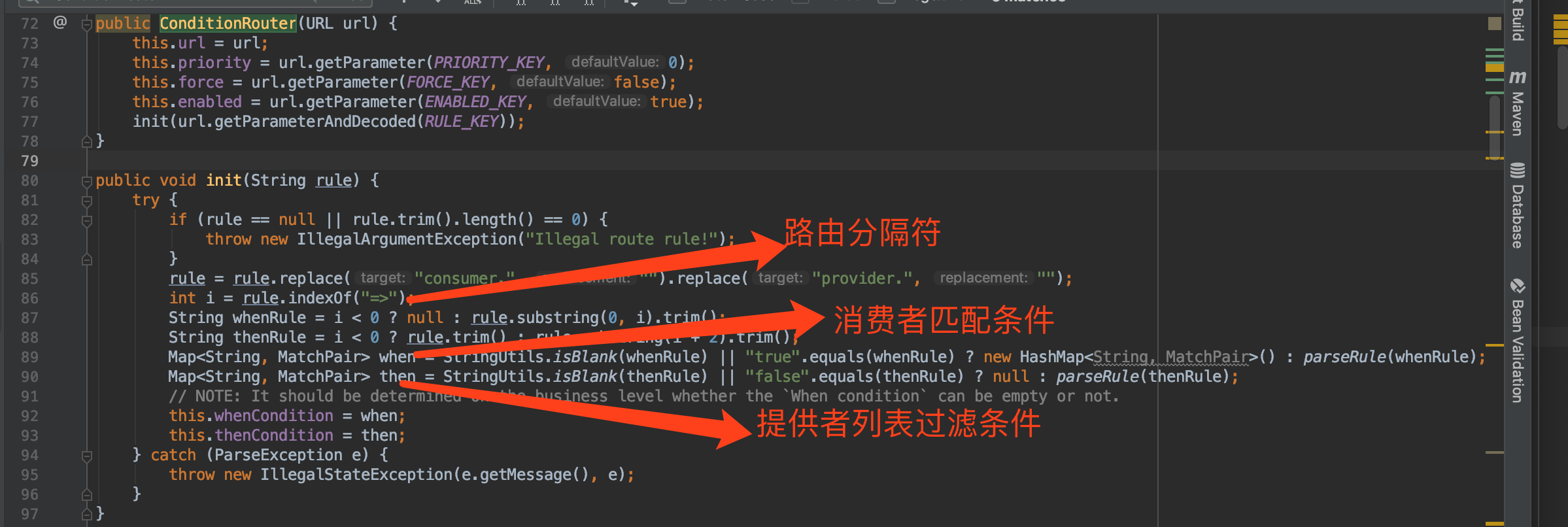 下面是ConditionRouter的实现,初始化rule时,会解析路由规则,通过分隔符“=>”, 前面是消 费着的过滤条件,后面是提供者过滤条件.