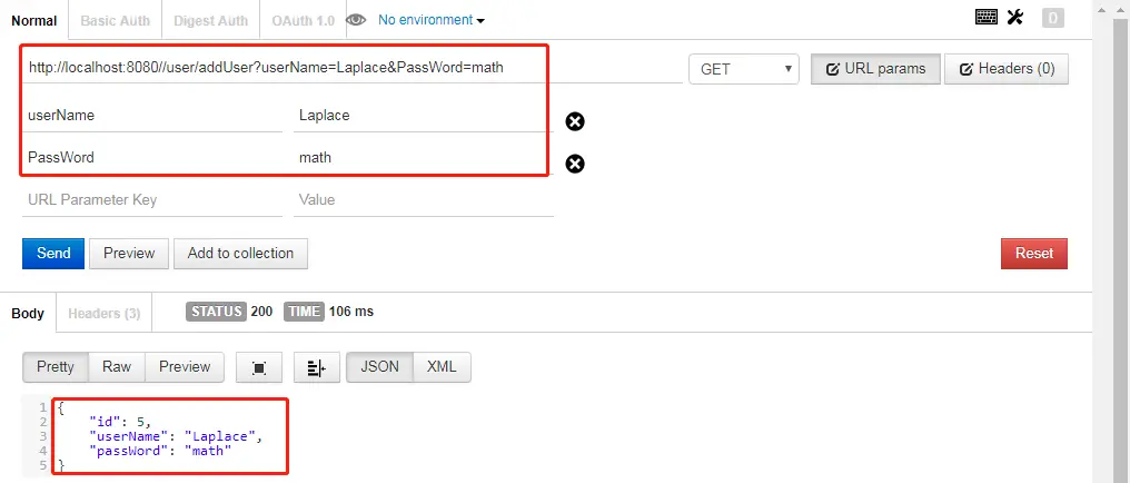 使用Postman访问http://localhost:8080//user/addUser?userName=Laplace&PassWord=math :