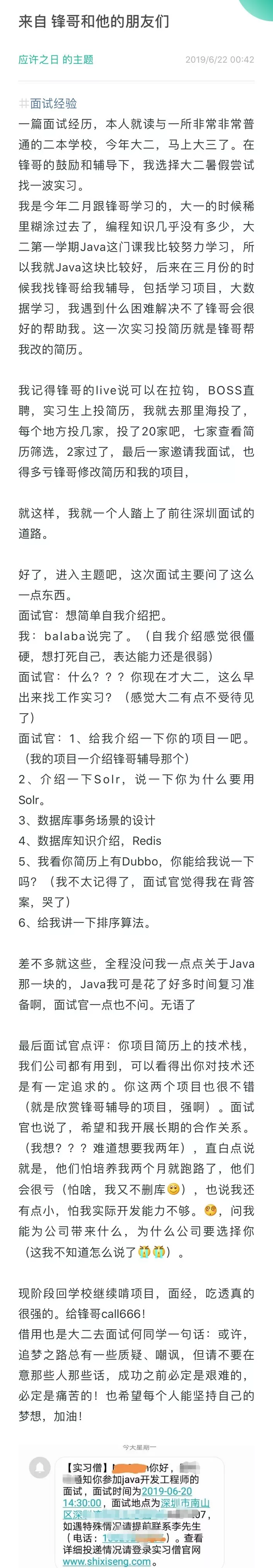 贴上前几天群里一个大二小伙伴的面试经历: